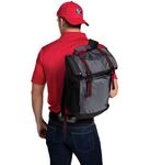 * 100% polyester ripstop microcheck with durable dobby side * 900-denier heavyweight 100% polyester with PU coating on heather colorway * 300-denier sides * Heavyweight coated vinyl on bottom of bag * Water-resistant * Magnetic zippered roll top main compartment with two secure slide release buckles * Side zipper for easy access to main compartment * Zippered top valuables pocket * Two mesh side pockets * Side zipper access for easy decoration and storage * Covered web handle at top of backpack * Adjustable padded shoulder straps * Mesh padded back * Media charging port * Internal zippered mesh valuables pocket * Internal neoprene sleeve for laptop or tablet * 12"W x 17"H x 8"D
